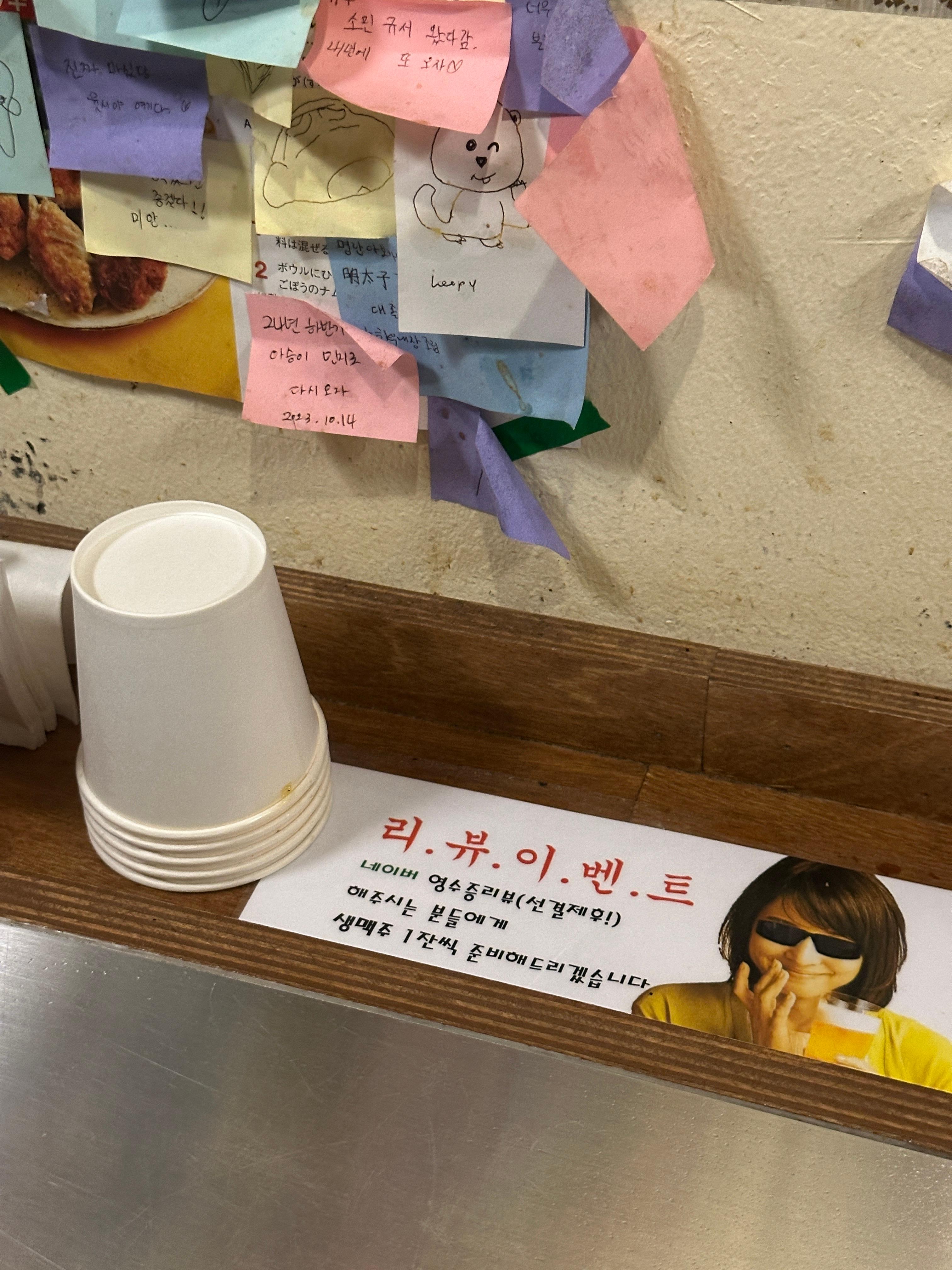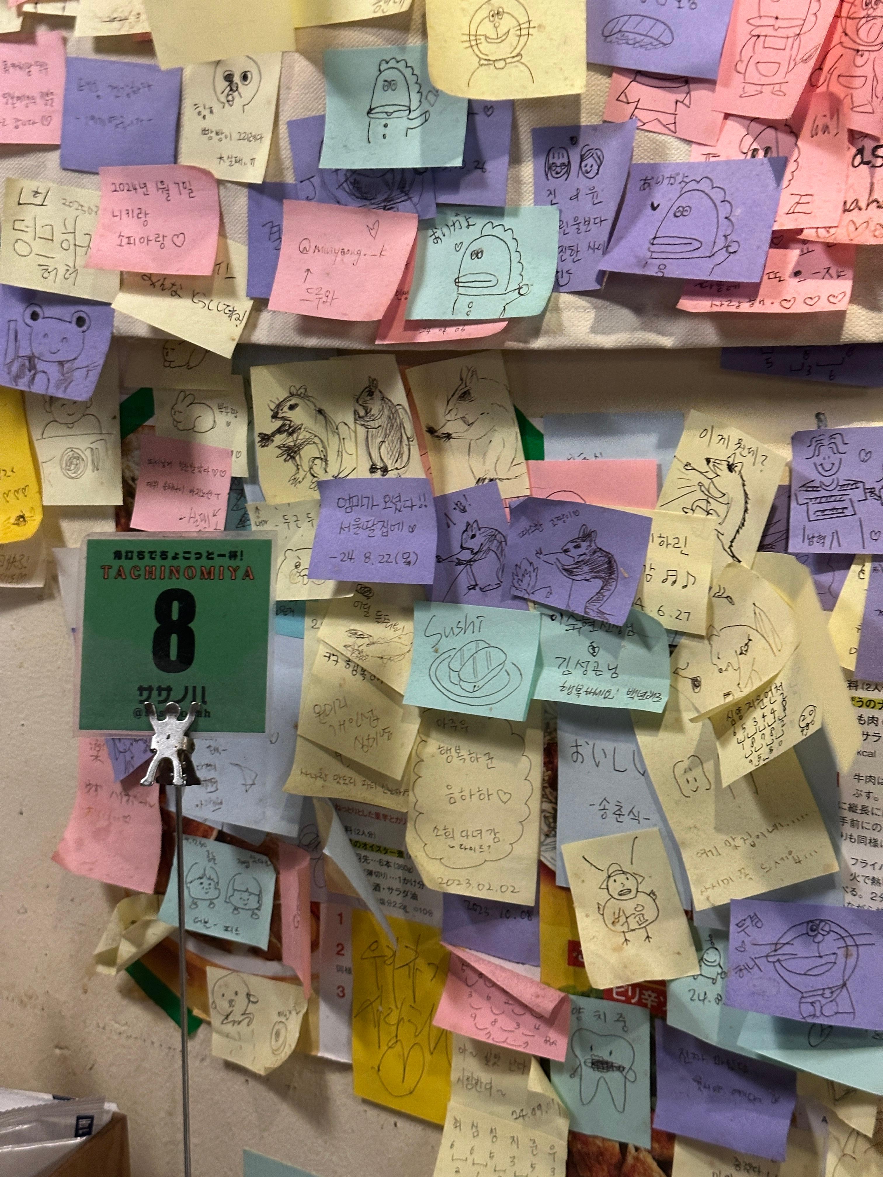 위치는 서울 송파구 백제고분로42길 4-13 101호, 석촌호수 근처에서 접근하기 좋은 골목에 자리 잡고 있어요. 일본식 타치노미야(立ち飲み屋) 느낌의 아담한 공간인데, 가게 벽면에 손님들이 남긴 포스트잇 낙서가 가득 붙어 있어서 들어서는 순간부터 활기찬 분위기를 느낄 수 있습니다