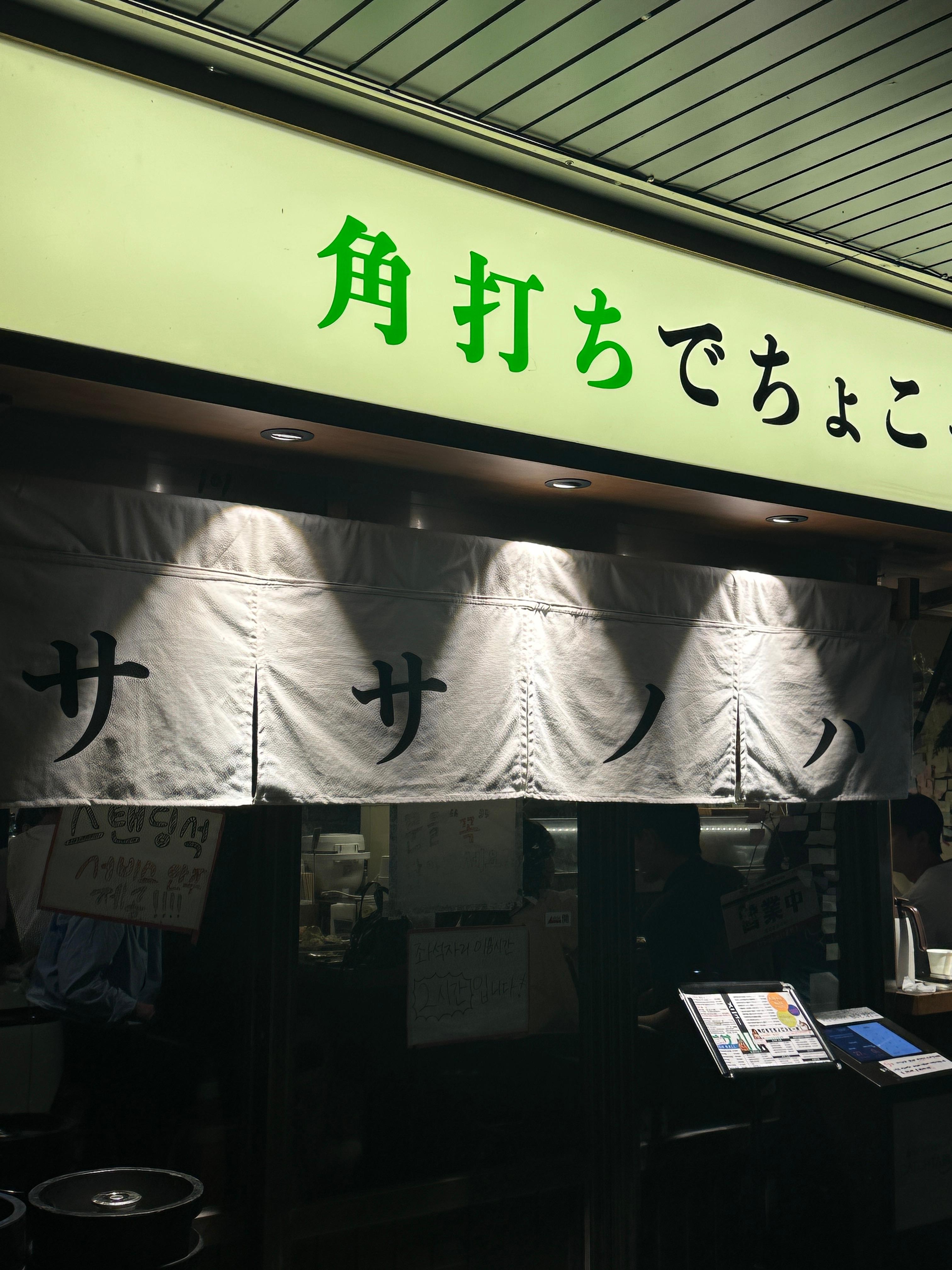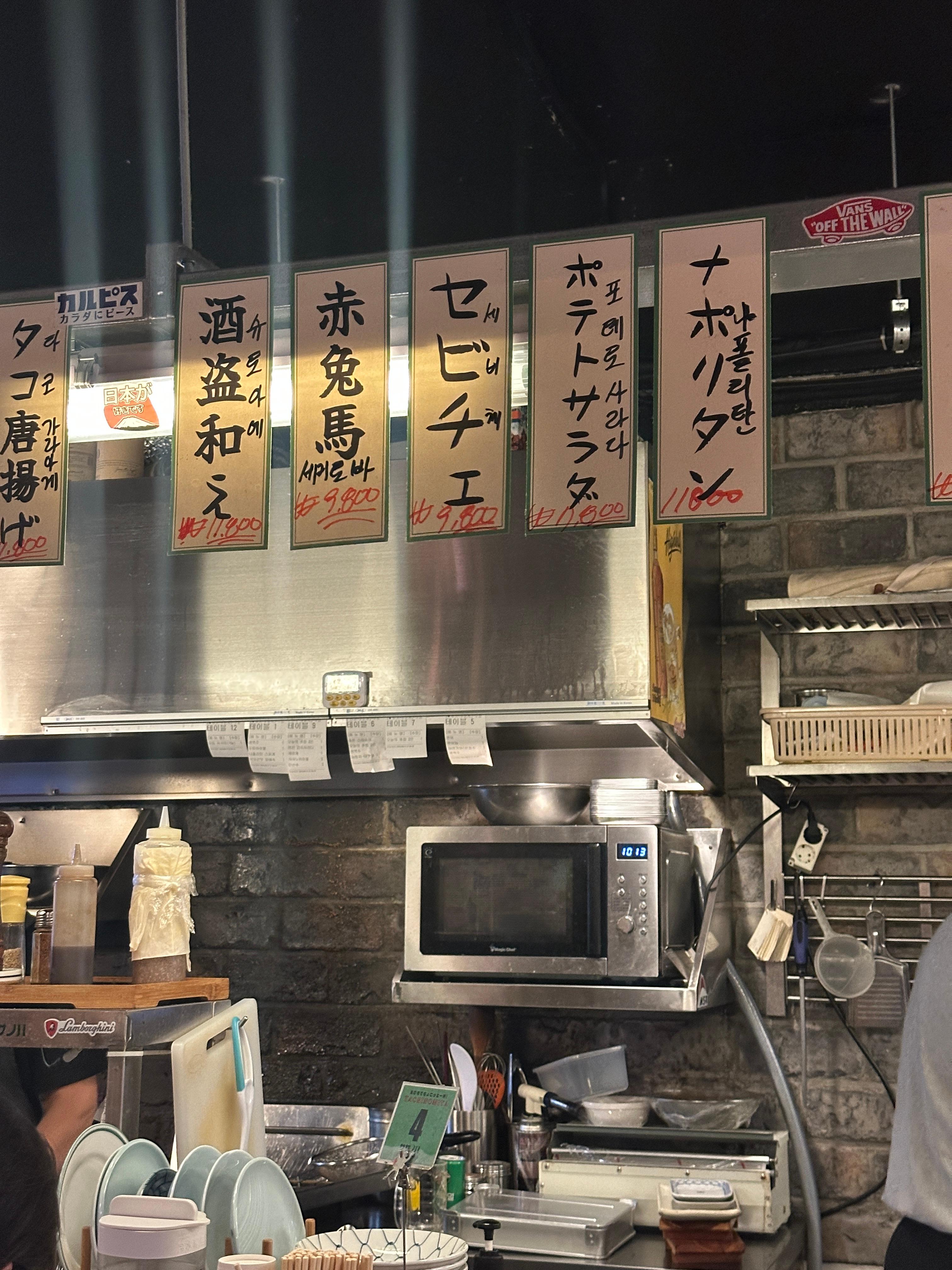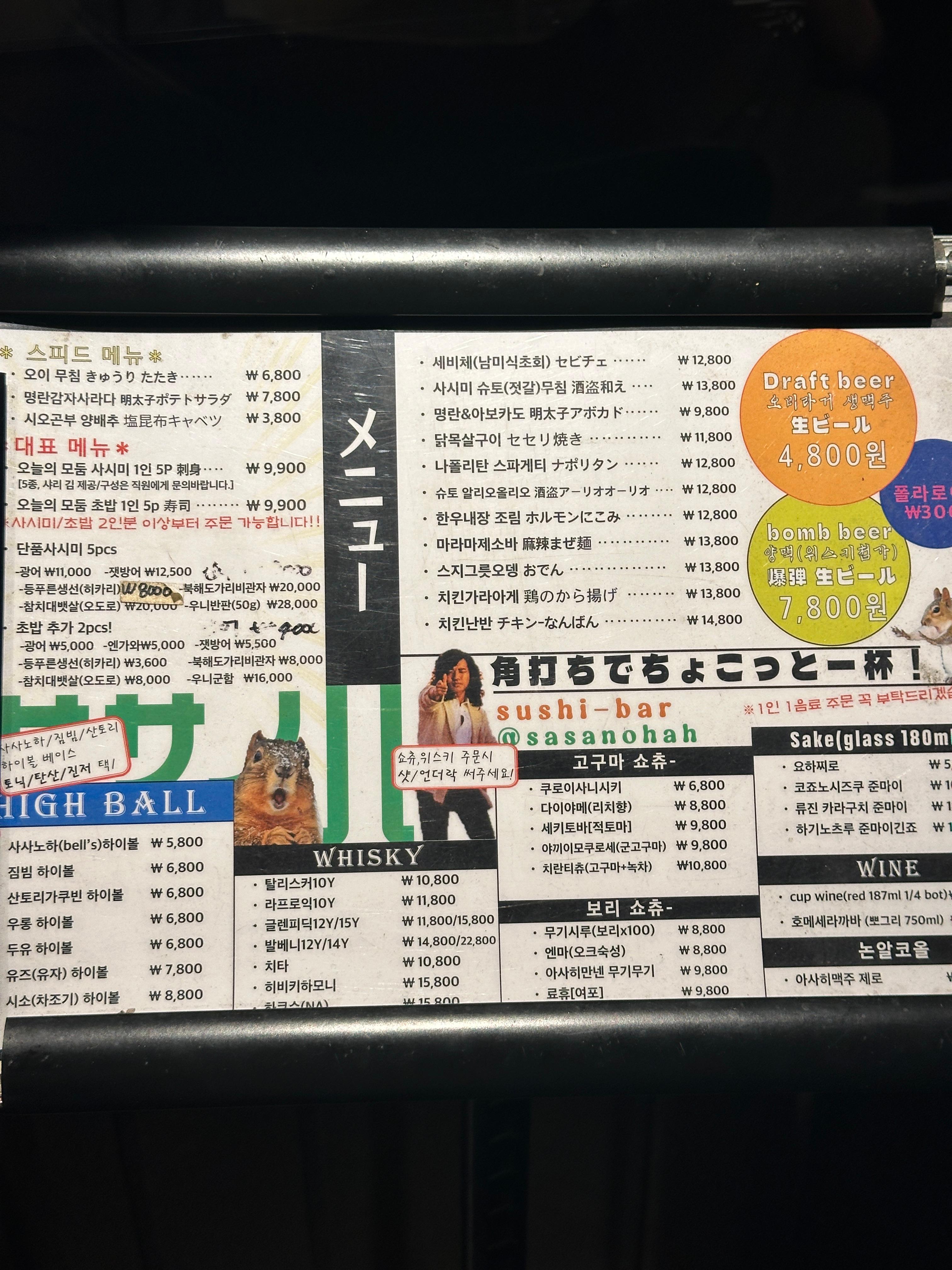 사사노하는 벽면에 걸린 일본어 메뉴판이 눈에 띄는데, 번역이 함께 적혀 있어 주문하기 어렵지 않았습니다.